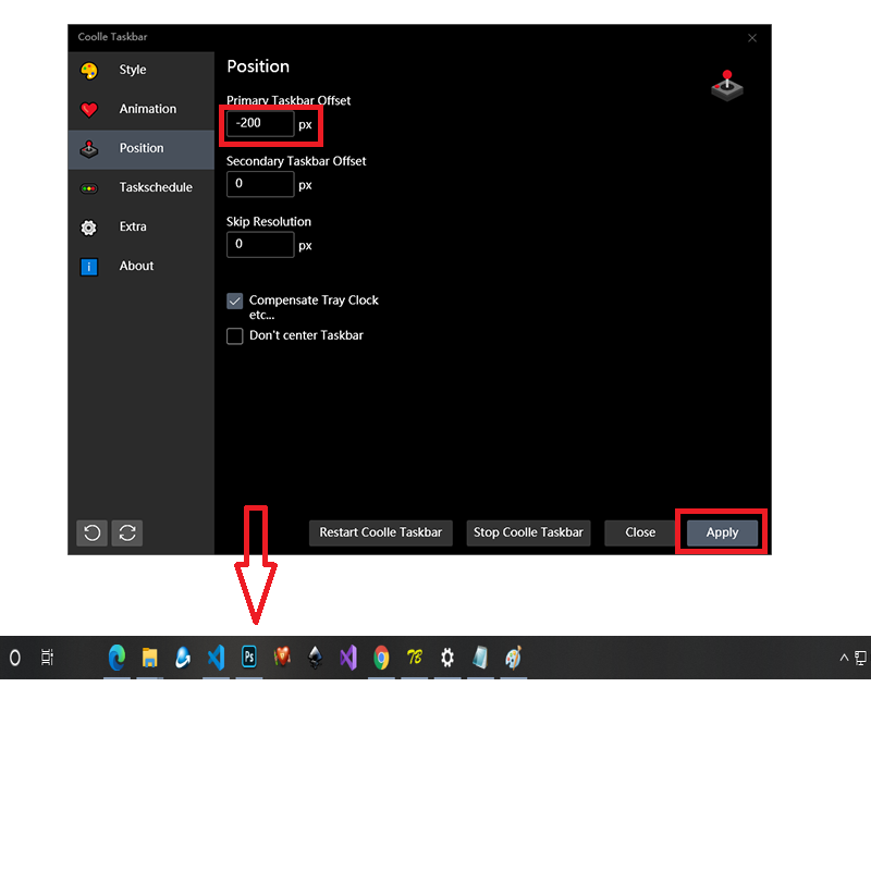 The Position menu allows you to adjust the position of the taskbar icons once they are in the center. For example, you can offset the icons using a positive or negative number of pixels (where a negative number will offset towards the Start Menu, and positive towards the system tray).
