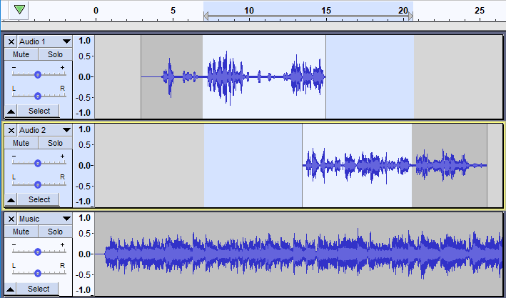 , click in the track just after 7.0 seconds in the first track, then drag rightwards to 20.5 seconds as displayed on the Timeline, then downwards so that the gray selection region now includes the second track: