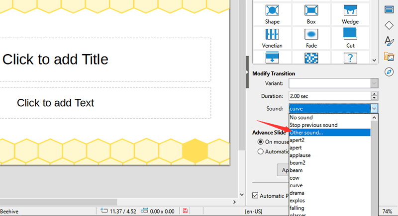 2. In the transition sidebar tab, Modify Transition - Sound. For a music track select Other tone. .