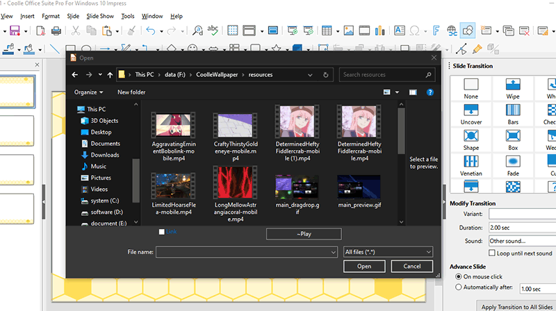3. A file explorer dialog window comes up where you can locate the desired music file. You can also select the option to Loop until the next clip. When Impress encounters another slide with a sound selected it terminates the current one and starts playing the new one.