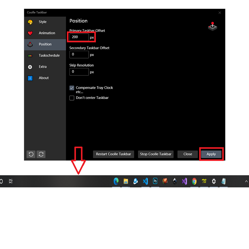 The Position menu allows you to adjust the position of the taskbar icons once they are in the center. For example, you can offset the icons using a positive or negative number of pixels (where a negative number will offset towards the Start Menu, and positive towards the system tray).