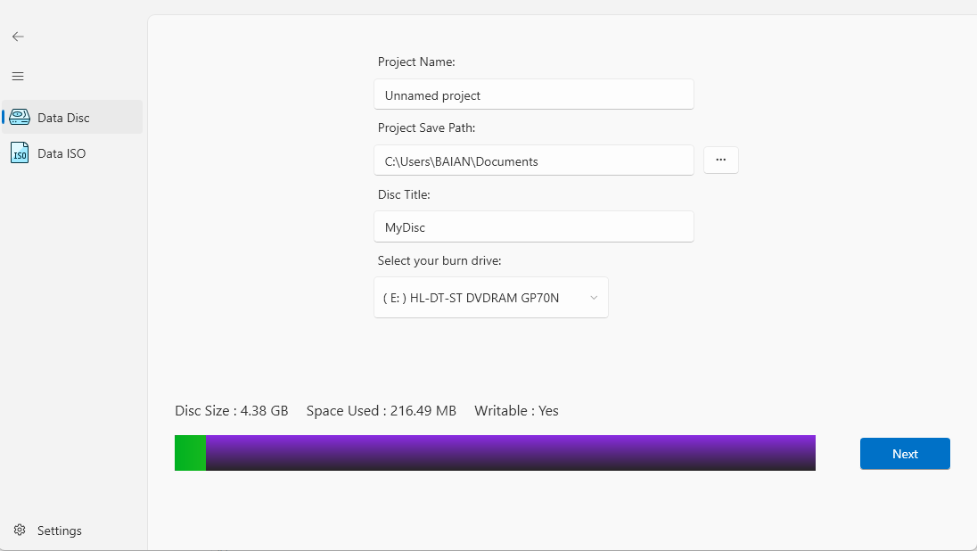 1. Launch the app, and choose data disc, and you select your burn drive:
