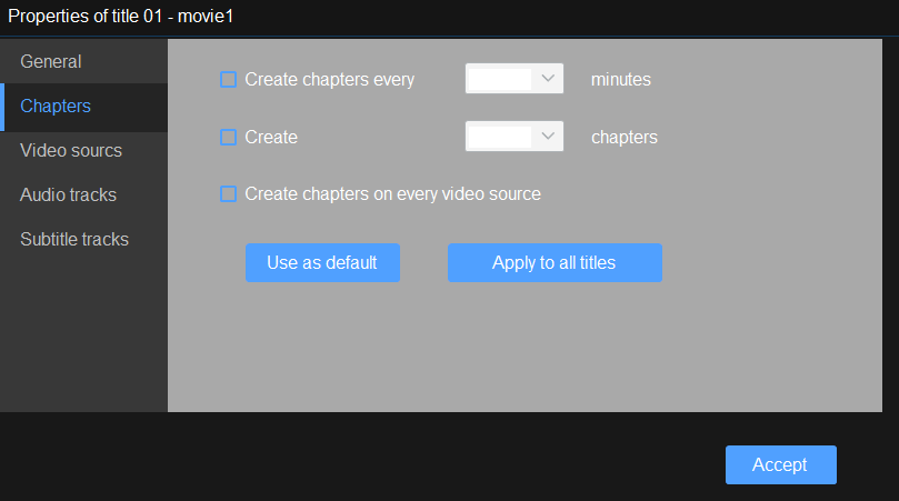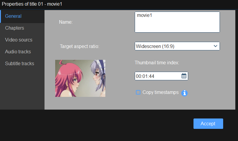 3. In the general tab, you could see the Name, Targe aspect ratio, Thumbnial tiem index. The name will be seen in the dvd title menu.