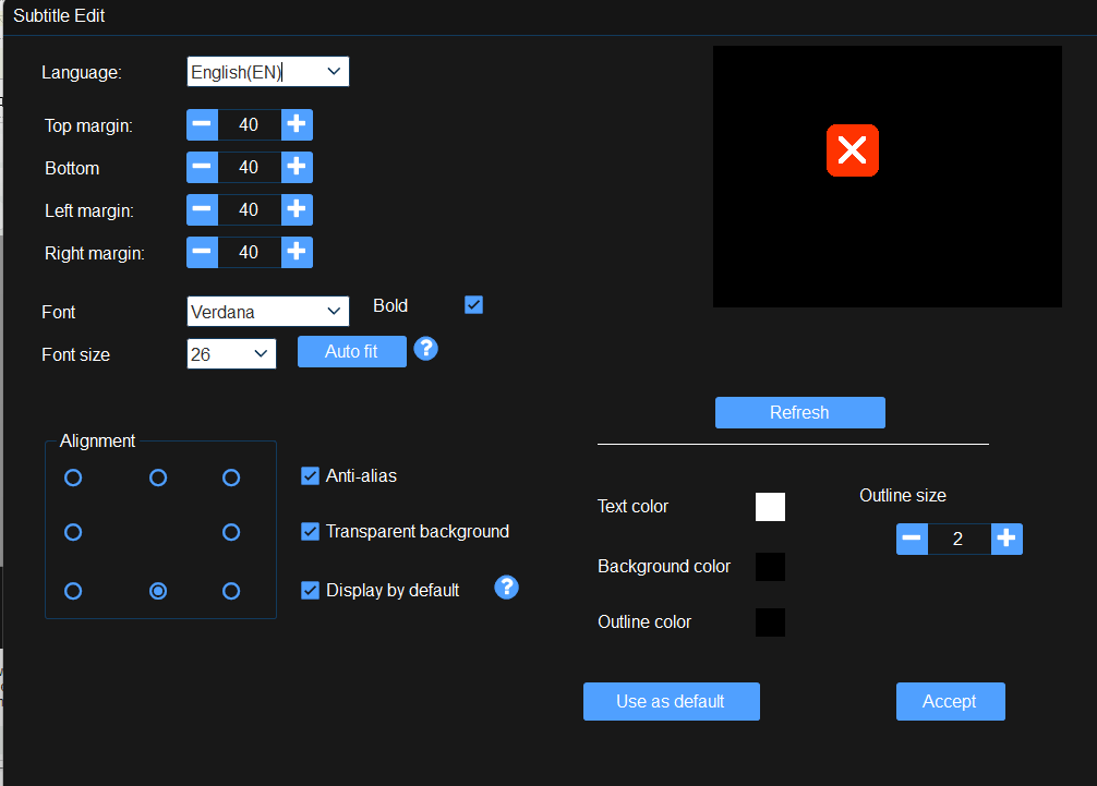 In the dialog of editing subtile, you could change the margin, font face, font size, font alignment, text color, outline color and so on.