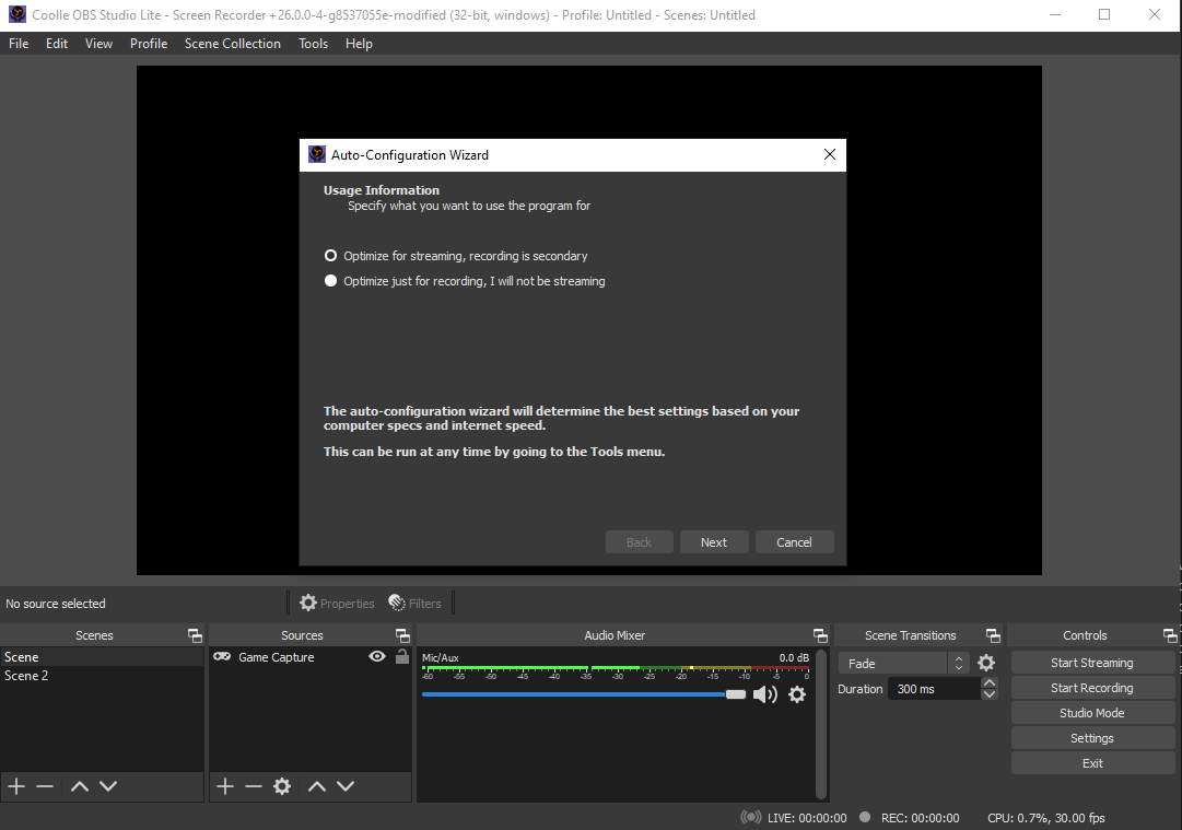 When you load Coolle OBBS Studio Lite for the first time you should see the Auto-Configuration Wizard. If you're new to Coolle OBBS Studio Lite or just want to get started as quickly as possible, follow the steps to get good starting settings for your setup. If you only see the main OBBS Studio window, you can access the Auto-Config Wizard in the Tools menu at the top. This wizard will automatically test your system and attempt to find settings that your PC can handle. This includes streaming or recording, resolution, bitrate, encoder, streaming provider and more. You can always modify the settings manually later.